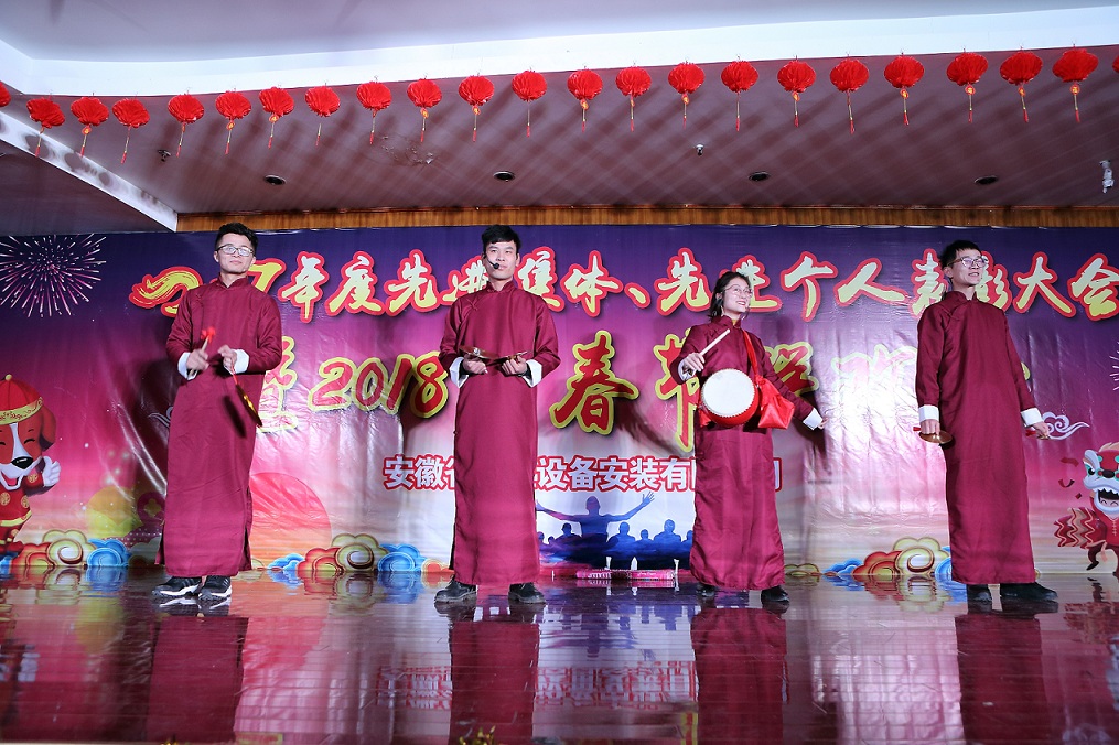 整場聯(lián)歡會(huì)由音歌快板、情景劇、小品、詩朗誦、舞蹈、才藝表演、女聲獨(dú)唱等12個(gè)節(jié)目組成,均為職工自編自導(dǎo)自演。伴隨著悅耳動(dòng)聽的音歌快板表演《企業(yè)興旺我自豪》,聯(lián)歡會(huì)正式拉開序幕。情景劇《我驕傲 我是省安人》,反映了安徽安裝人用勤勞和汗水,創(chuàng)造了一個(gè)個(gè)值得驕傲的碩果;詩朗誦《風(fēng)雨同行 以心筑夢》,展現(xiàn)了安徽安裝人不斷開拓新市場,實(shí)現(xiàn)新突破的壯麗征程;舞蹈《精忠報(bào)國》,傳遞了安徽安裝人激昂豪邁,強(qiáng)烈愛國主義的情懷;情景劇《擼起袖子加油干》,表達(dá)了安徽安裝人不忘初心,團(tuán)結(jié)一致砥礪奮進(jìn)的決心;男生合唱《明天會(huì)更好》,抒發(fā)了全體安徽安裝兒女同心同德,共筑企業(yè)燦爛明天的美好心愿,歡快的音符,優(yōu)美的旋律,振奮的歌詞,贏得了現(xiàn)場觀眾的歡呼喝彩與陣陣掌聲,將現(xiàn)場的氣氛推向高潮。演出過程中還穿插了抽獎(jiǎng)和游戲環(huán)節(jié)。